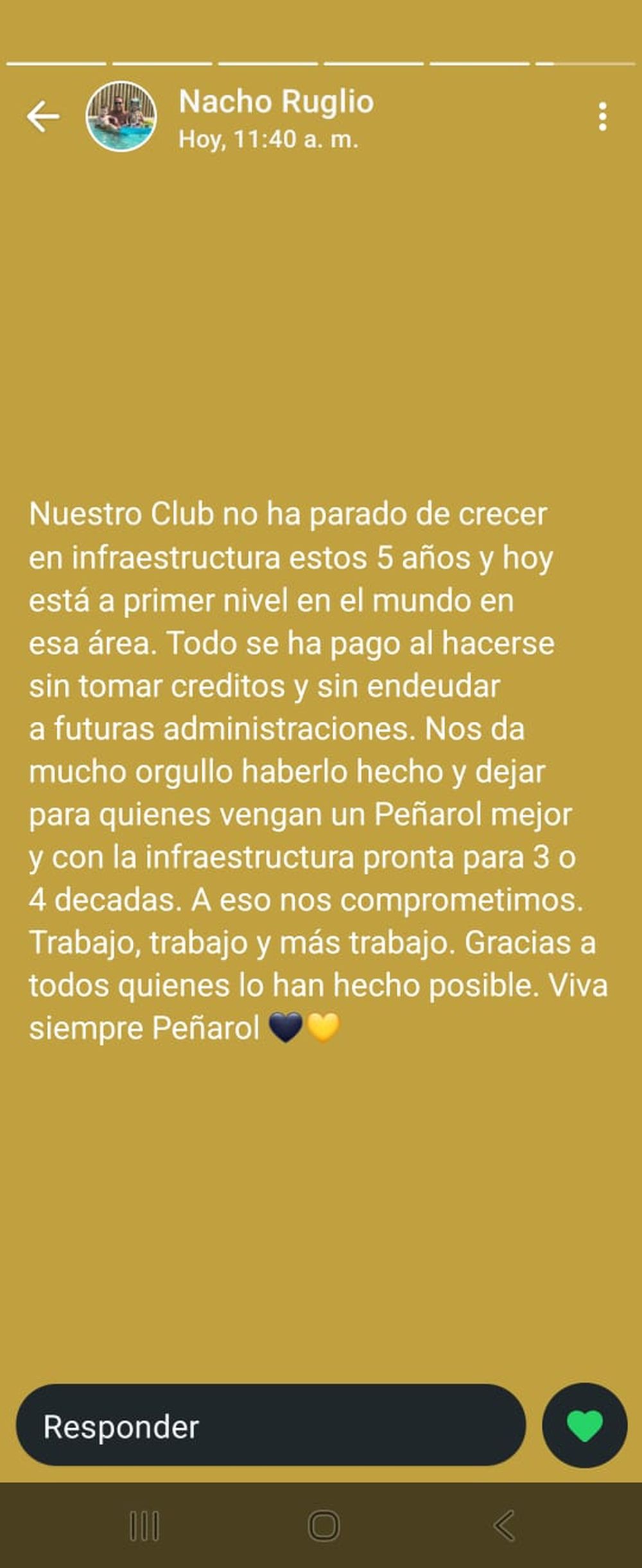 El presidente de Peñarol, Ignacio Ruglio, destacó en un estado de WhatsApp el gran crecimiento que Peñarol ha tenido a nivel de infraestructura desde que él asumió en la presidencia.