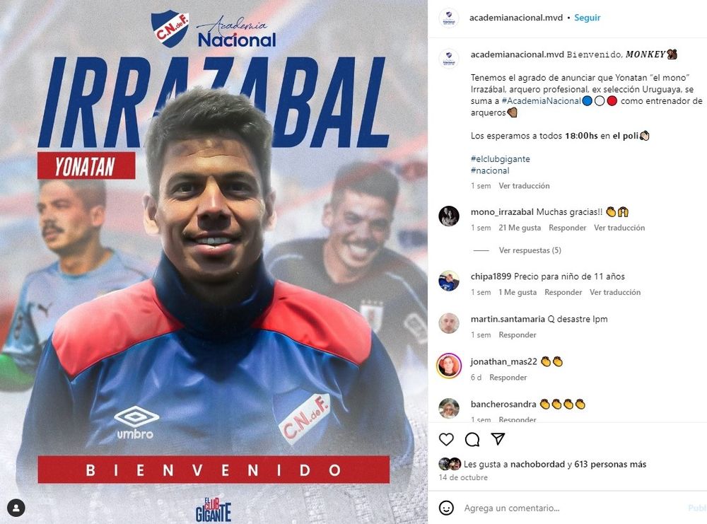 Yonatan Irrazabal, ex arquero de Defensor Sporting y actualmente en River Plate, se incorporó a la Academia de Nacional, la escuela de fútbol anual del club tricolor. Cumplirá la tarea de entrenador de arqueros de los niños: "Tenemos el agrado de anunciar que Yonatan "el mono" Irrazabal, arquero profesional, ex selección uruguaya, se suma a Academia Nacional", se anunció en redes sociales.