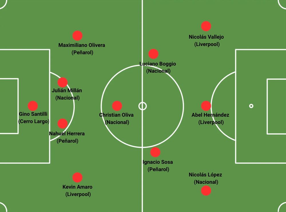 Gino Santilli (Cerro Largo); Kevin Amaro (Liverpool), Nahuel Herrera (Peñarol), Julián Millán (Nacional), Maximiliano Olivera (Peñarol); Christian Oliva (Nacional), Ignacio Sosa (Peñarol), Luciano Boggio (Nacional); Nicolás López (Nacional), Abel Hernández (Liverpool) y Nicolás Vallejo (Liverpool).