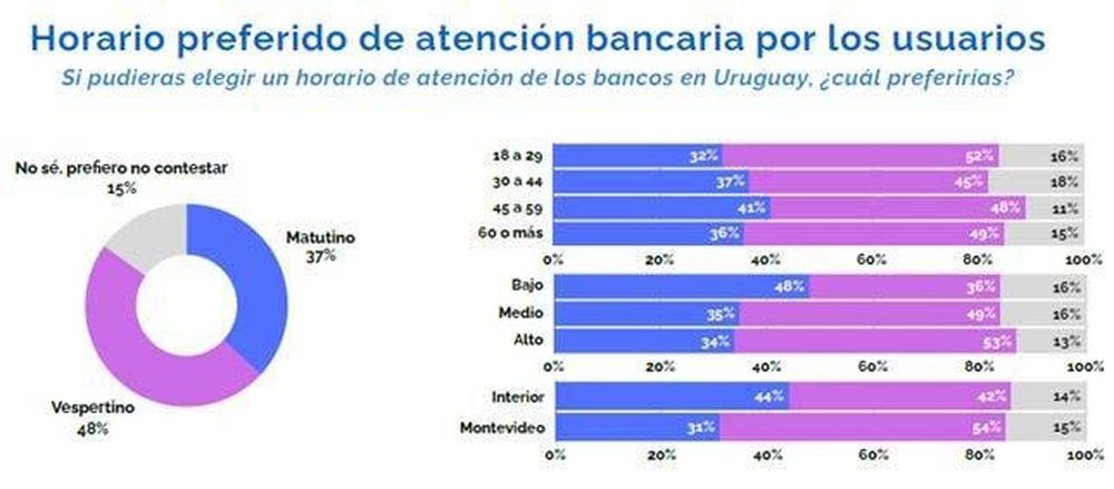 Para analizar este aspecto, AEBU realizó una investigación a través de la Usina de Percepción Ciudadana, buscando conocer la visión de los clientes sobre el cambio. Los resultados son claros en establecer que la mayoría de ellos prefiere el horario vespertino, siendo las personas mayores y las más jóvenes, aquellos de los sectores económicos medios y altos y los residentes de Montevideo, quienes prefieren de manera ampliamente mayoritaria el horario de la tarde.