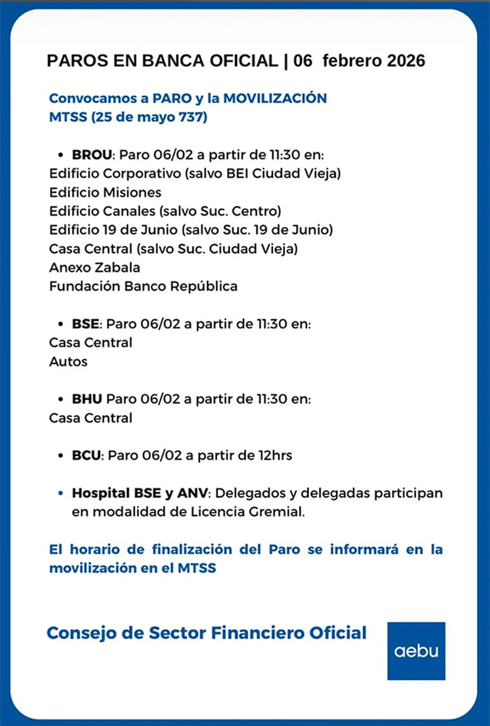 Este viernes, los trabajadores de la banca pública, organizados a través de la Asociación de Bancarios del Uruguay (AEBU), llevarán a cabo un paro parcial con movilización hacia el Ministerio de Trabajo y Seguridad Social (MTSS), que comenzará alrededor del mediodía. La medida afectará a distintas dependencias del Banco República (BROU), Banco de Seguros (BSE), Banco Central (BCU) y Banco Hipotecario (BHU).