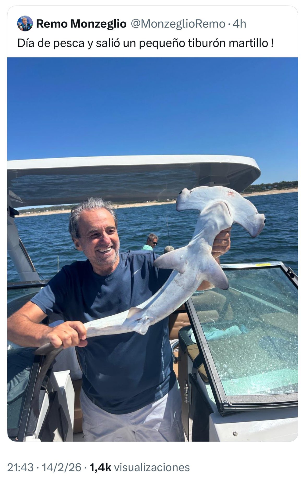 La semana pasada, Monzeglio divulgó mediante su cuenta de X una foto donde se lo ve con un tiburón martillo en las manos. "¡Día de pesca y salió un pequeño tiburón martillo!", escribió.