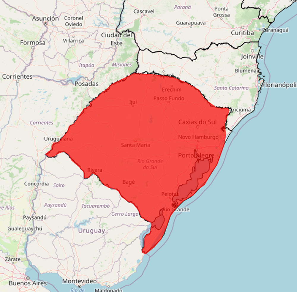 La alerta abarca regiones del suroeste, noroeste, centro-oeste, sudeste y noreste de Rio Grande do Sul, además de sectores de Santa Catarina, incluyendo áreas del oeste y sur de ese estado.