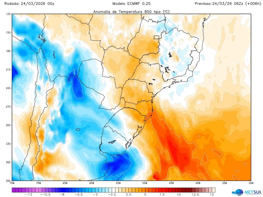 El fenómeno se hizo sentir con mayor intensidad en el estado de Rio Grande do Sul, en zonas próximas a Uruguay, donde se registraron mínimas de entre 10°C y 15°C. En ese sentido, Metsul señaló que la masa de aire frío “solo influyó en parte del estado, donde el tiempo durante las primeras horas de la mañana fue más despejado y con aire seco”.