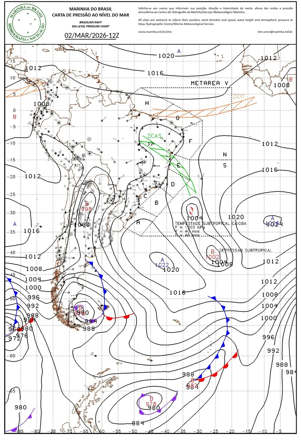 La Marina de Brasil informó este lunes la formación de la tormenta subtropical Caiobá en el Atlántico Sur, el primer ciclón atípico con nombre desde 2024. El sistema se ubica en mar abierto, a los 30°S y 32°O, con una presión central de 1003 hPa, y se desplaza hacia el sur-sureste, alejándose del continente.