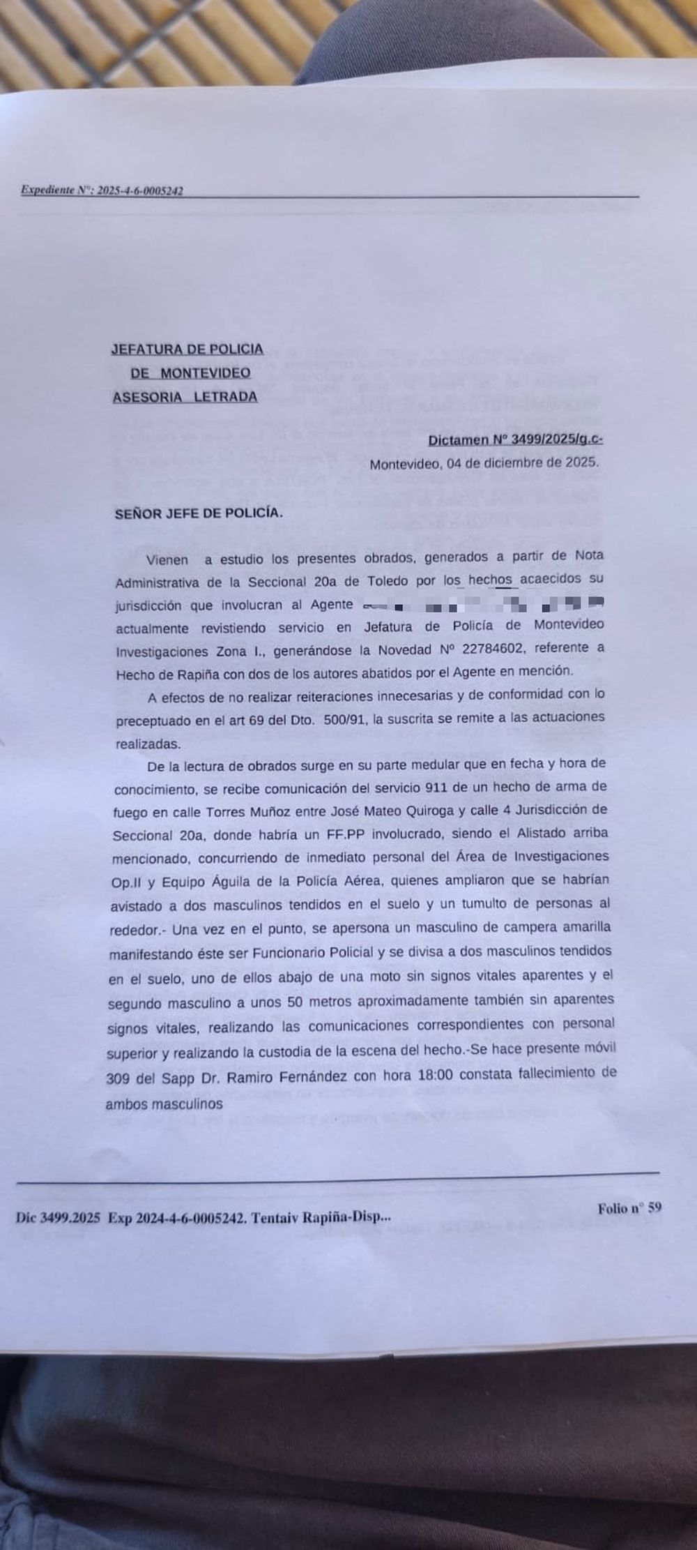 Cabe destacar que el superior del policía en cuestión emitió un informe en el que calificó su concepto funcional como "bueno". En relación con el accionar del agente, la Justicia se expidió sobre cuatro intervinientes, quienes fueron condenados por el delito de rapiña especialmente agravada, con uno de los condenados siendo menor de edad e internado en el Instituto Nacional de Inclusión Social Adolescente (Inisa).