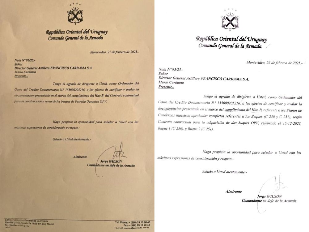 Los documentos recabados por el gobierno muestran que el almirante envió una aprobación el 26 de febrero, un día antes que Cardama enviara su última modificación de la cuaderna maestra. Luego, el 27 envió otra, algo que el Poder Ejecutivo supo tiempo después al cruzar información con el Deutsche Bank.