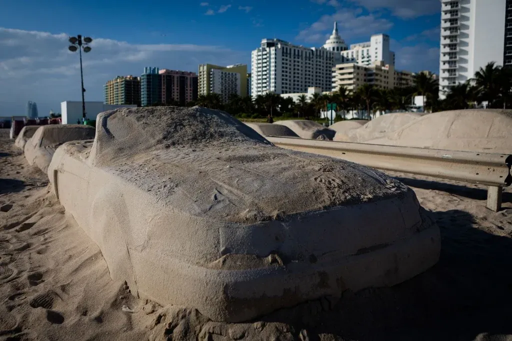 Sobre la playa de Miami Beach, unos 64 vehículos cubiertos de arena forman un atasco aparente frente al mar. Es uno de los hitos de la Semana del Arte en esta ciudad de Florida, en el marco de la feria internacional Art Basel, que comienzó esta semana.