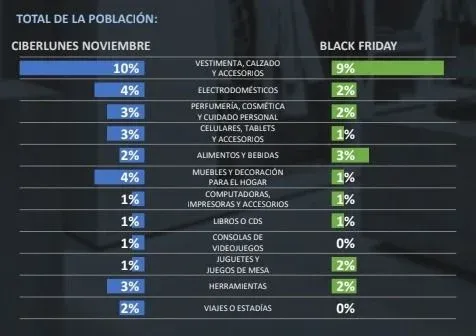 Vestimenta, calzado y accesorios son los productos que más se compran durante ambas jornadas de descuento. Según el informe, se registró un descenso en la incidencia de compra en tres categorías: electrodomésticos; celulares, tablets y accesorios; y muebles y decoración.