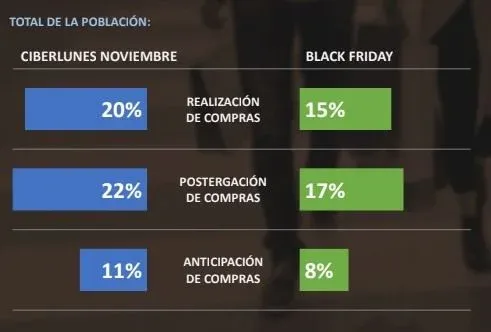 Al celebrarse a fines de noviembre, el Black Friday está orientado a que se aproveche la jornada de descuentos para hacer las compras navideñas, sin embargo, el estudio realizado por Factum muestra que en el Ciberlunes se realizan más compras, hay “mayor nivel de anticipación de compras” y mayor “nivel de postergación de compras” que el viernes negro.