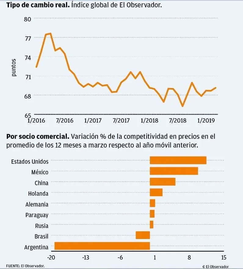 La economía uruguaya perdió competitividad en precios con los países de la región en los últimos meses, lo que profundiza las dificultades para venderle productos locales en los mercados vecinos. Sin embargo, respecto a los países de fuera de la región la competitividad en precios mejora debido a la suba del dólar más pronunciada en Uruguay que en relación a Europa, China y Rusia. El saldo es levemente positivo.