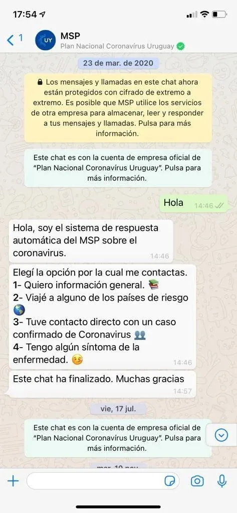 Primero debe agregar como contacto de su celular un número del Ministerio de Salud Pública (098 999 999). A ese número, o también al chatbot que está en el sitio www.gub.uy o al que aparece en Messenger de Facebook, el usuario puede escribirle una consulta. Lo único que permitía hasta ahora era contestar con un número cuatro opciones que allí aparecían. Por ejemplo, si alguien le ponía "Hola", el sistema arrojaba cuatro opciones y solo invitaba al usuario a escribir esa consulta en números