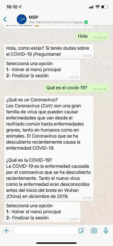 De esta forma, en vez de escribir el número "1", el usuario podrá preguntarle: "¿Qué es el covid-19?". Y el sistema contestará: "¿Qué es un coronavirus?