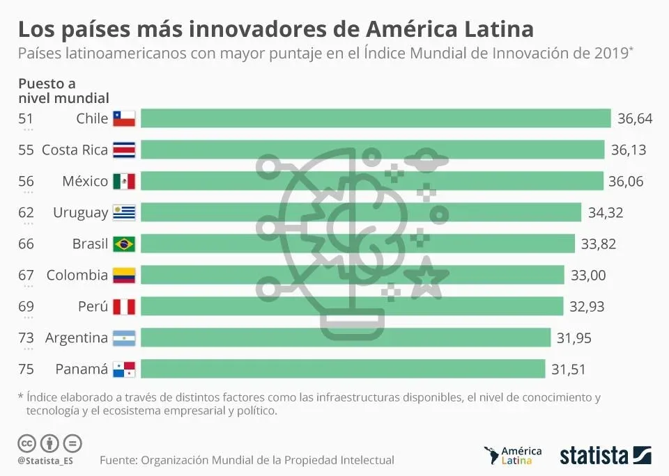 Según los resultados del Índice Mundial de Innovación 2019, elaborado cada año por la Organización Mundial de la Propiedad Intelectual (OMPI), el progreso en materia de innovación en América Latina y el Caribe sigue siendo más lento que en otras regiones. El informe de esta edición resalta que, a pesar de algunas iniciativas alentadoras, el potencial en investigación y desarrollo (I+D) de la región permanece en gran medida sin explotar. De los países evaluados, Chile, líder de Latinoamérica y Caribe, no aparece hasta el puesto número 51 con un puntaje de 36,64 en el índice. A este le siguen Costa Rica (posición 55) y México (puesto 56), con una puntuación de 36,13 y 36,06, respectivamente.