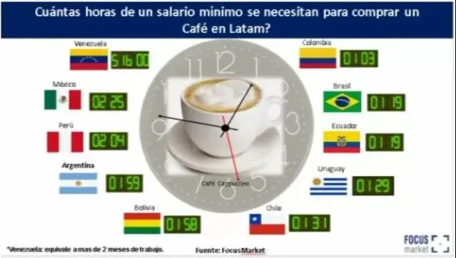 Para el caso de la compra de un Café en Venezuela se requieren 516 horas, en México 2,25, en Perú 2,4, en Uruguay se requieren 1,29, mientras que en Brasil se requieren 1,19 y en Colombia 1,3 minutos, ambos países con producción local de café.