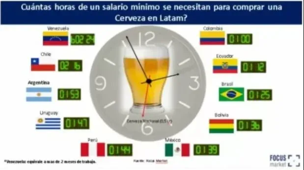 Para el caso de la compra de una Cerveza en Venezuela se requieren 602 horas con 24 minutos, en Chile 2 horas y 16 minutos, en Argentina 1 hora con 53 minutos, en Uruguay 1 hora con 47 minutos, en Ecuador se requieren 1 hora con 12 minutos y en Colombia 1 hora.