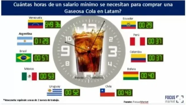 Para el caso de la compra de una Gaseosa Cola en Venezuela se requieren 549 horas y media, en Argentina 1 hora con 29 minutos, en Uruguay se requieren 52 minutos, en Perú 37 minutos y en Ecuador 29 minutos.