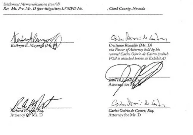 La revista alemana demostró también las firmas de Ronaldo, Mayorga y los abogados que intervinieron en el caso. Además de publicar dentro del documento el compromiso del portugués de entregarle a la modelo los resultados de la prueba de VIH, para la tranquilidad de ella, lo que confirmaría que la relación sexual se llevó adelante sin protección por parte de él.