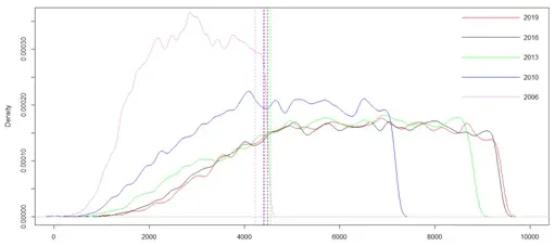 Los gráficos 1 y 2 se focalizan en la distribución de ingresos de las personas pertenecientes a los 4 primeros deciles de la escala de ingresos de la población, esto es, el 40% de personas de menores ingresos, mostrando su evolución entre los años 2006 y 2019 en términos reales. Ambos gráficos permiten apreciar que en el último ciclo de crecimiento se registró un marcado incremento del poder de compra de estas personas. Mientras que en 2006 un 32.5% del total de personas, contaba con ingresos inferiores al umbral de pobreza, esto es una amplia mayoría de las personas situadas en los primeros cuatro deciles, en 2019 solo un 8.8% de personas se clasifica como pobre (no alcanza a la totalidad del primer decil) [4]. Puede apreciarse, asimismo, que gran parte de las estas personas, no solo pasaron a situarse por encima de la línea de pobreza, sino que en 2019 superan ampliamente dicho umbral de ingresos[5].