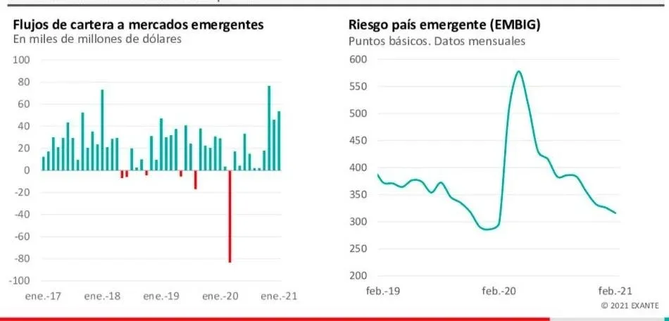 Además, Rosselli señaló que los flujos de capitales hacia economías emergentes volvieron a ser positivos y revirtieron enteramente la salida de la primera parte de 2020. A su vez, las primas de riesgo en las economías emergentes cayeron fuertemente.