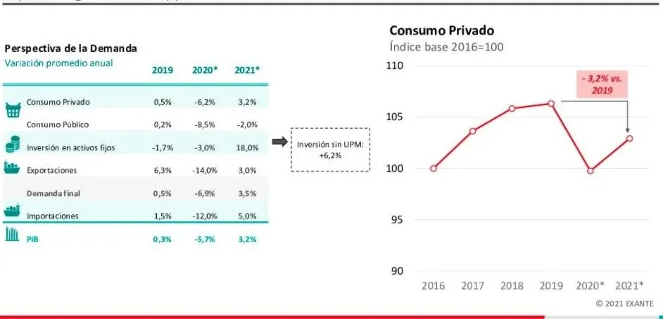 Las proyecciones de Exante apuntan a que en 2020 el Producto Interno Bruto (PIB), habría caído 5,7% (el dato oficial del BCU se conocerá en marzo). Y en 2021 la actividad crecería 3,2%, tras un inicio con menor dinamismo dado la fuerte afectación registrada en la actividad turística por el cierre de fronteras.
