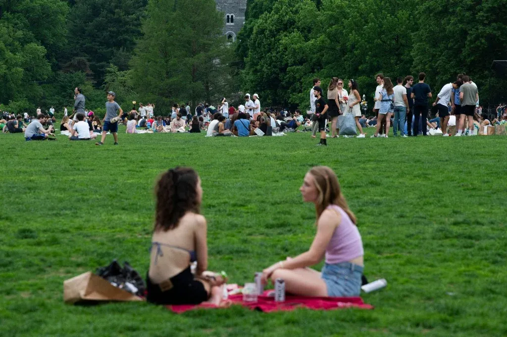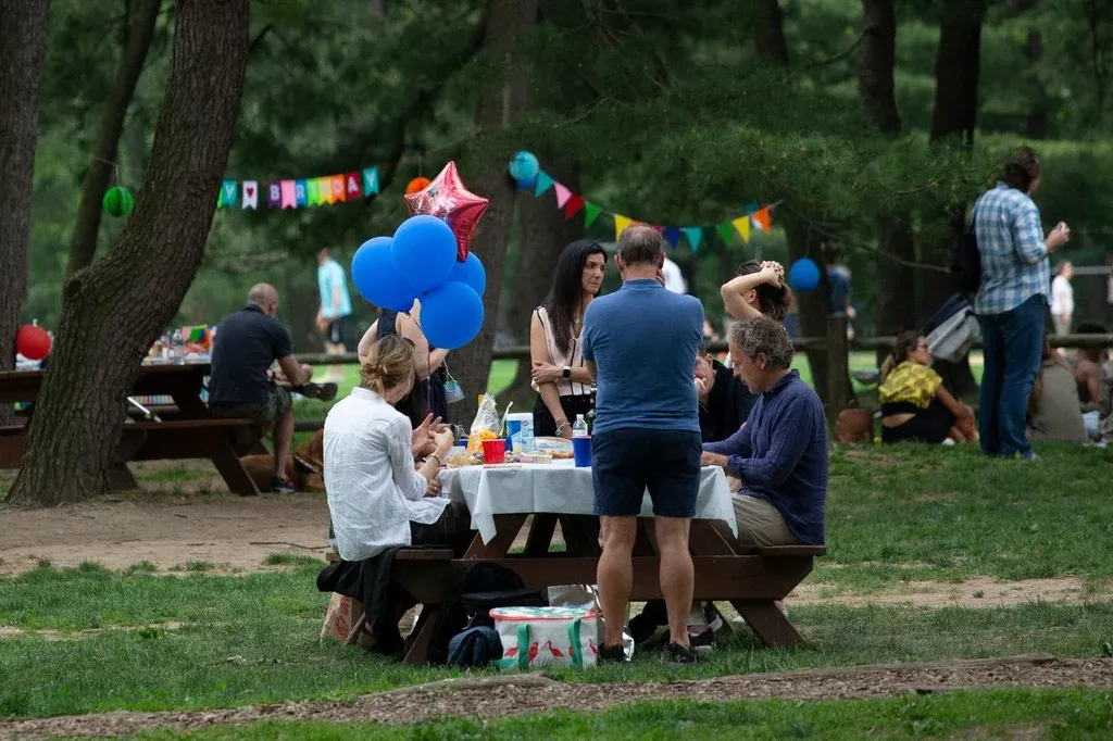 Por la "seguridad" de sus invitados, "casi todos" completamente vacunados, lo organizó afuera, en Central Park, con mesas y sillas plegables, globos sujetados de los árboles y comida para alimentar a un ejército.