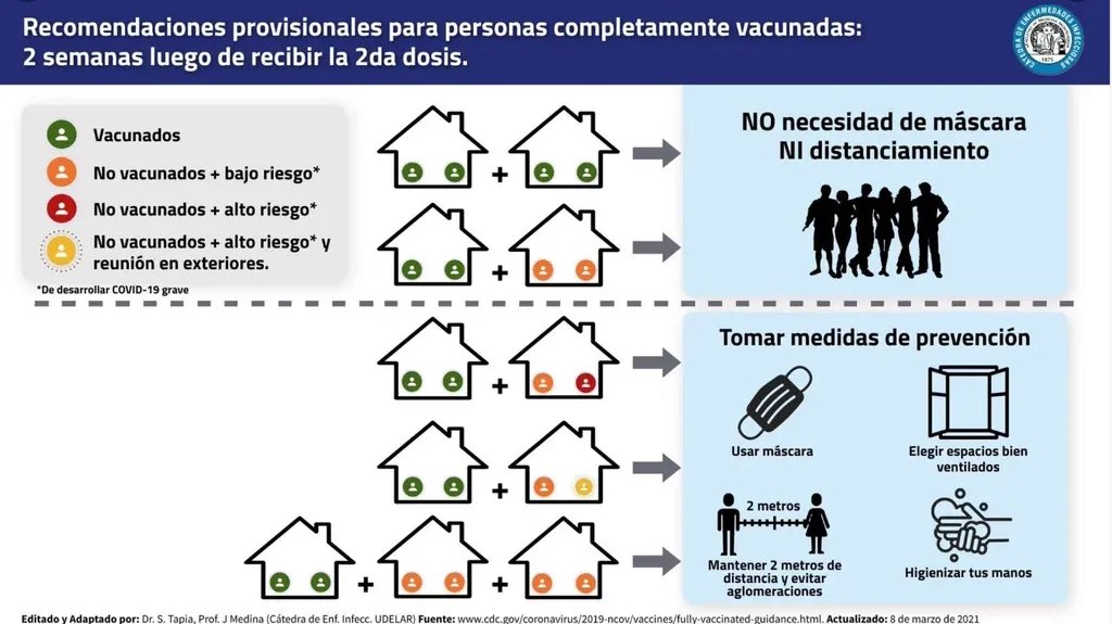 No obstante, en los casos en que se junten vacunados y no vacunados pero sí considerados población de riesgo, es necesario usar mascarilla e incluso ventilar el ambiente. Y si se concurre a un lugar en donde pueda generarse una concentración de personas, corren las medidas de siempre: máscara y dos metros de distancia.