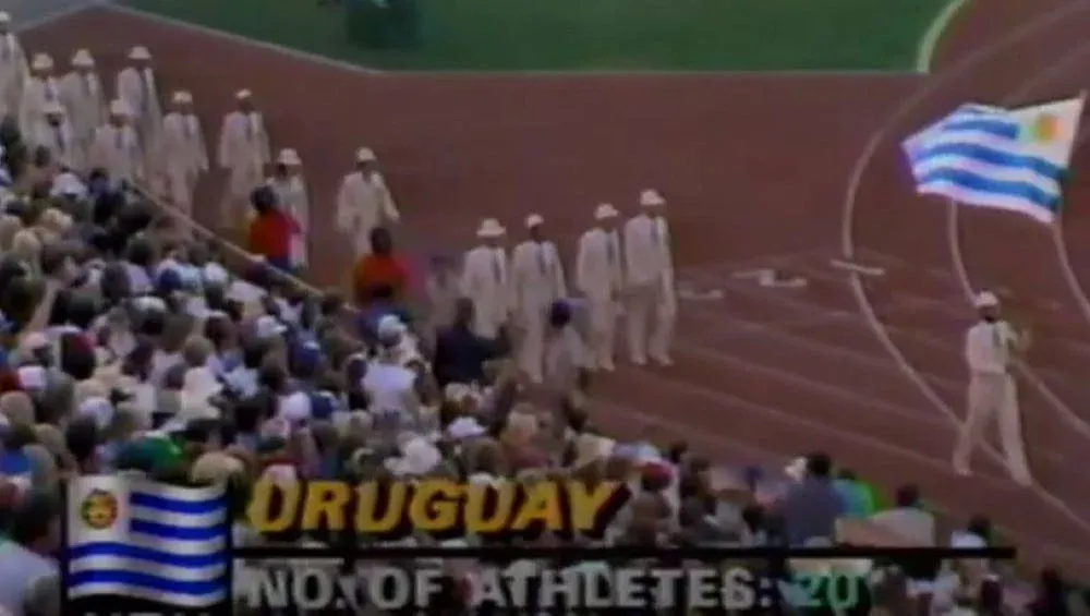 Wilfredo Ruiz y toda la delegación uruguaya vestida de beige con el chambergo que el Fefo después le cambió a Carl Lewis ¿Y cómo se dio?