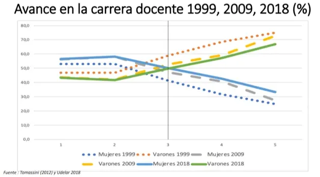 La primera mujer que se recibió de médica en Uruguay fue Paulina Luisi, en 1908. Pasaron 112 años. En 2020 los que dirigen cátedras, facultades y asociaciones son, en su gran mayoría, hombres. La variación en un lapso de 18 años demuestra que las mujeres están llegando más a todos los grados docentes, pero no tanto al grado superior, según un estudio de la investigadora de la Udelar Cecilia Tomassini. Entre 1999 y 2009 la participación de mujeres en grados 3 y 4 aumentó en 11% y 16%, respectivamente, mientras que en el grado 5 subió 7%. Todo esto con el telón de fondo de que desde hace al menos 30 años los ingresos de estudiantes mujeres superan a los varones en títulos de grado.
