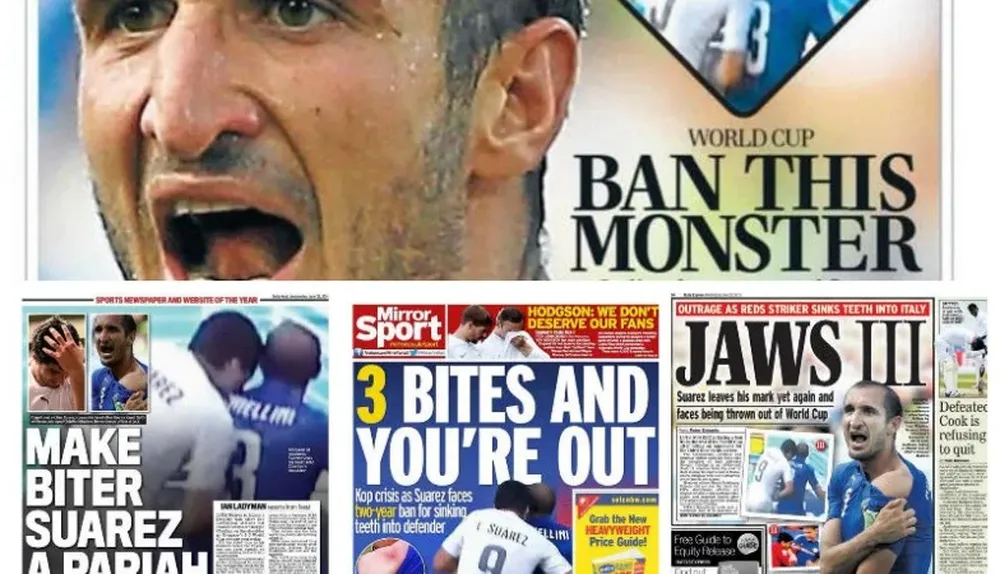 “Tres mordiscos y estás eliminado”, fue el titulo de Mirror Sports, en donde aparece una imagen del hombro de Chiellini, en la presunta zona de la mordida, en un tono más rojo que en otras fotos divulgadas. Por su parte, Daily Mail tituló: “Hagan del Suárez mordedor un paria”, al tiempo que Daily Express puso en su portada “Tiburón 3”.
