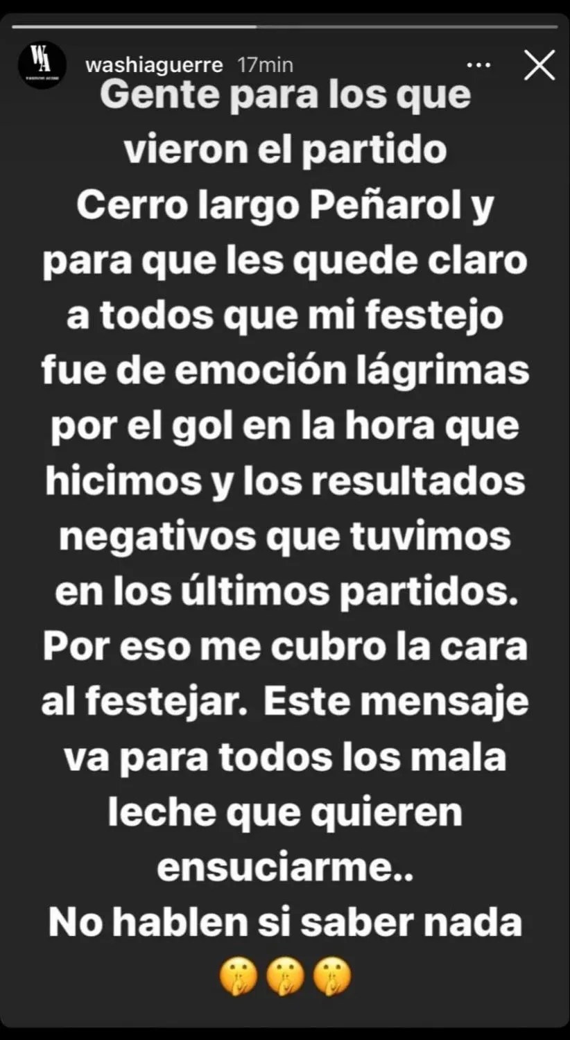 “Gente, para los que vieron el partido Cerro Largo -Peñarol y para que les quede claro a todos, mi festejo fue de emoción, lágrimas, por el gol en la hora que hicimos y los resultados negativos que tuvimos en los últimos partidos”, escribió Aguerre en su Instagram