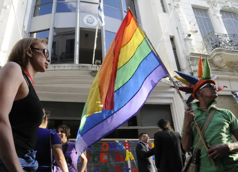 Unas cien personas se manifestaron en la puerta del Registro Civil, ubicado en la peatonal Sarandí de la Ciudad Vieja, para protestar contra la postergación de la votación de la ley que permite el matrimonio entre personas del mismo sexo. La movilización debió organizarse en un corto tiempo, ya que la decisión del Senado se dio a conocer este mismo miércoles. Como siempre, hubo mucho colorido: gorros y banderas con los colores del arcoiris podían verse por doquier.