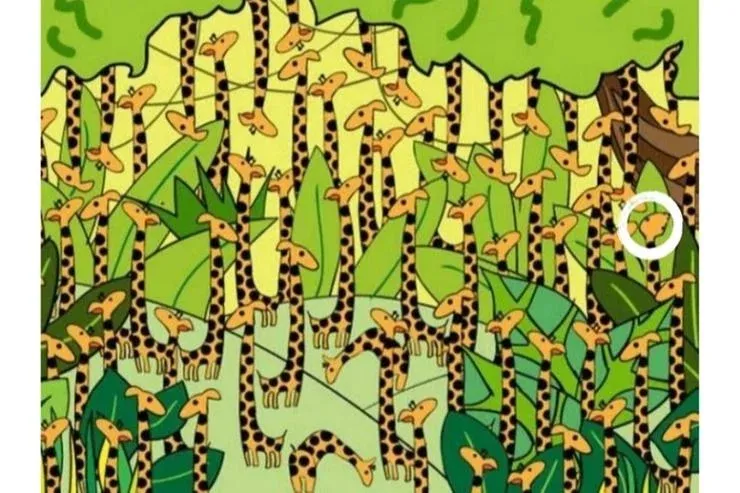 Esta vez el reto consiste en encontrar una serpiente entre una selva de jirafas. La agudeza visual y la concentración son claves para localizar al reptil amarillo y negro camuflado en la imagen.