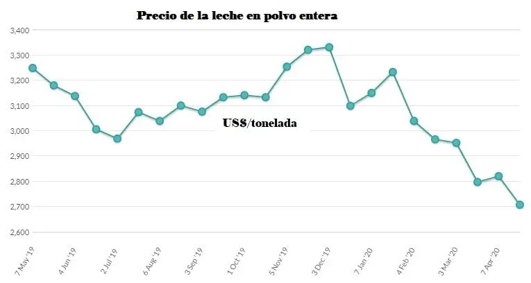 En el caso de la industria láctea, la principal incertidumbre hoy gira sobre los precios y los niveles de demanda que fijará el mercado internacional para lo que resta del año. La principal referencia para el mercado mundial de los lácteos –los remates quincenales que realiza la neozelandesa Fonterra– han pautado una racha claramente bajista para los principales productos. La leche en polvo entera (el principal producto lácteo que exporta Uruguay) cotiza hoy a unos US$ 2.700 por tonelada, unos US$ 500 menos que hace un año.