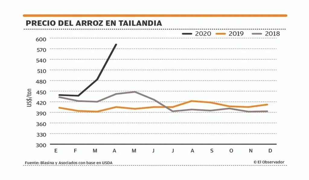 En la agricultura hay realidades disímiles. Dos de los cultivos más importantes (soja y arroz) estarán por estos días pasando raya a los números productivos de su cosecha, y luego verán a qué precios se termina colocando esa producción en el exterior. Como se encargó de presentar en este buen informe de Blasina y Asociados, este cereal será de los primeros en tirar el carro para la reactivación de la economía. El arroz en Tailandia –segundo mayor exportador del mundo– alcanzó este mes los US$ 587 la tonelada, US$ 100 más que el mes pasado (US$ 483), y se consolidó como el mayor valor desde julio de 2012, según los datos del Departamento de Agricultura de Estados Unidos (USDA).