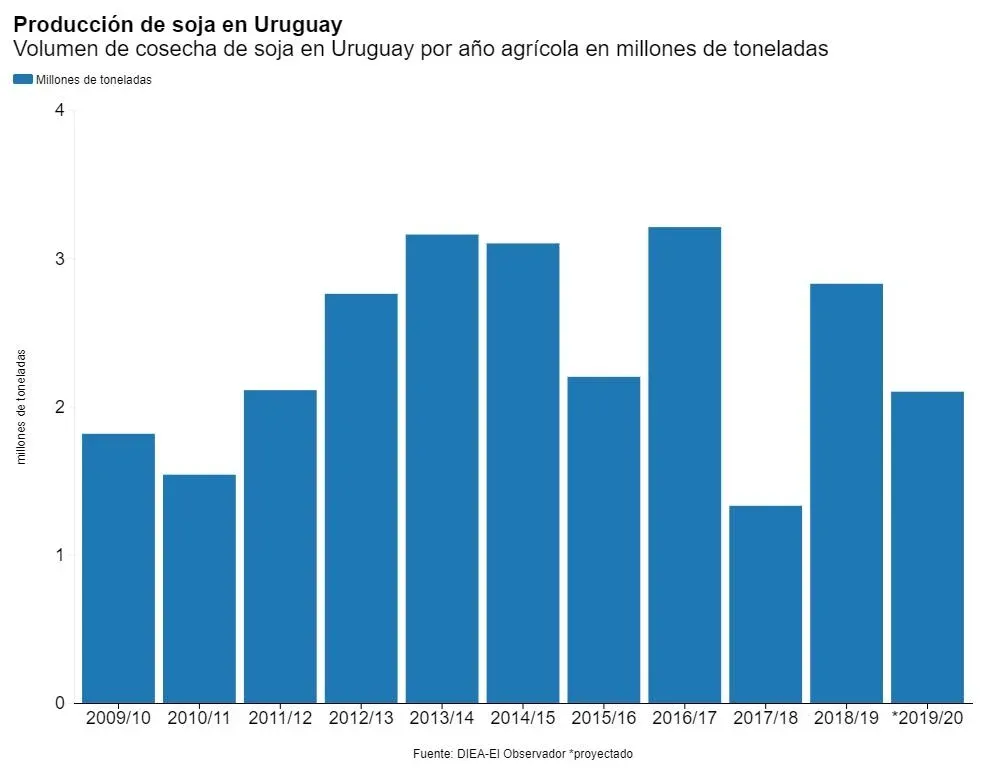 Distinta es la situación de la soja. Aunque todavía no está el detalle fino de cuánto caerá el rendimiento promedio por el impacto de la sequía de verano, en números gruesos se maneja una producción en un rango de 2,1- 2,2 millones de toneladas. Ese volumen se dará básicamente por una baja del rendimiento por ha que pasará de 3.000 kilos en la zafra 2018/19 a unos 2.100 kilos/ha en la que está culminando. Así, el volumen exportable se reducirá en 1 millón de toneladas, equivalente a unos US$ 300 millones a los valores de hoy de la oleaginosa.