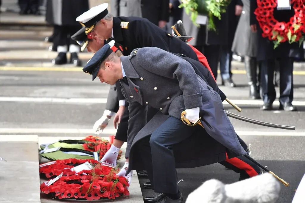 La reina le cedió a su hijo, el Príncipe Carlos, su puesto para que se encargara de colocar la ofrenda floral como parte de la misa en el cenotafio. Los príncipes William y Harry también realizaron la ofrenda mientras que todas las integrantes femeninas –vestidas de negro y con amapolas rojas– observaban desde distintos balcones.