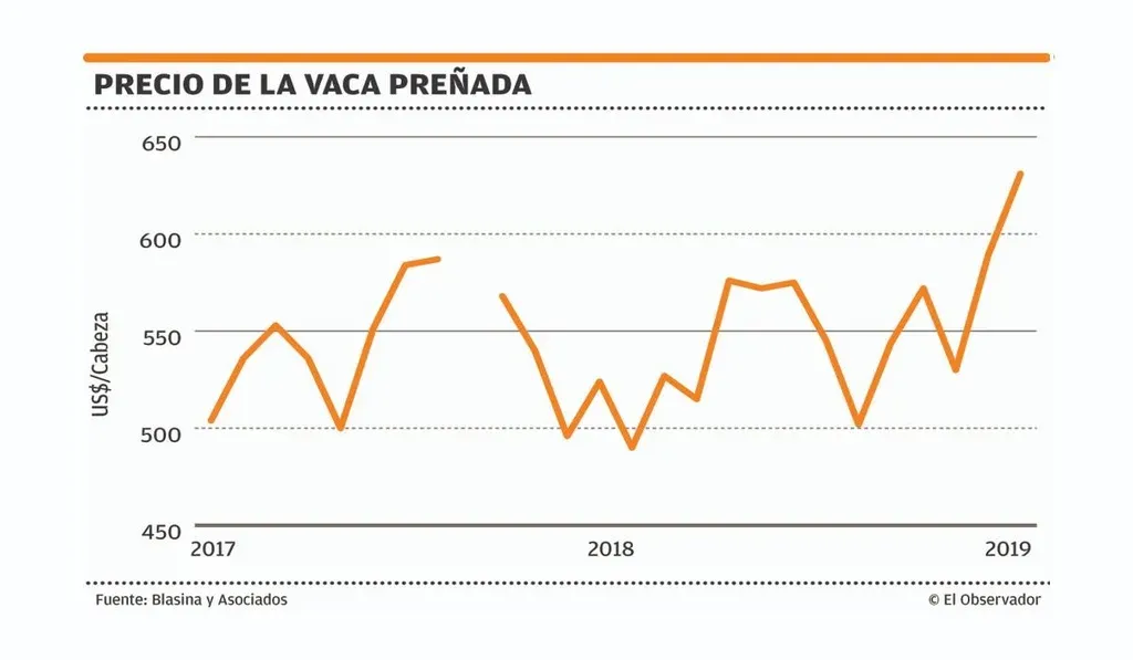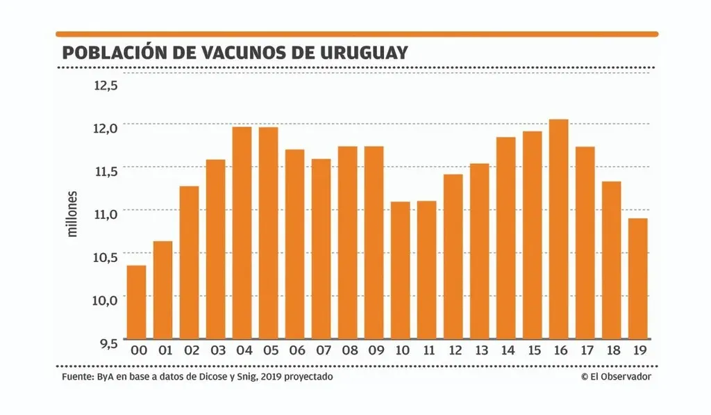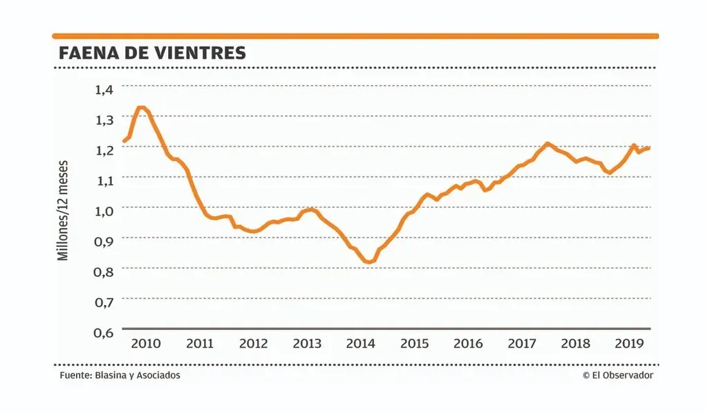 El sector cárnico funcionó en 2013 con una faena anual de dos millones de vacunos, de los cuales 870 mil fueron vientres y casi 1,1 millones novillos. En los últimos 12 meses la faena está en 2,3 millones, con la misma faena de 1,1 millones de novillos y la extracción de vientres ha pasado a 1,2 millones. La baja faena de vientres de 2013 llevó el stock de 11,5 millones en aquel año a 12 millones en 2016. Inversamente, la alta faena de vientres y en términos relativos al stock la fuerte salida de terneros y novillos –en pie o a frigorífico– llevó a que el stock se derrumbara de 12 millones a 11,3 millones en 2018 y eso puede quedar en menos de 11 millones a mediados de este año. En 2019 la faena de vacas sigue creciendo, cubriendo novillos que no están.