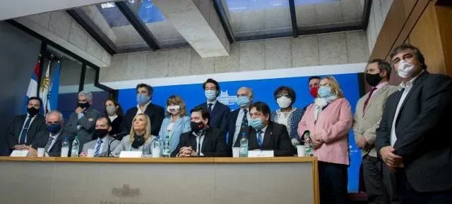 La presidenta de la Asamblea General, Beatriz Argimón, está en el centro de la foto. A su derecha, el líder de Cabildo Abierto, Guido Manini Ríos, y el senador nacionalista Gustavo Penadés. A su izquierda, el senador colorado Adrián Peña y el diputado del Partido de la Gente, Daniel Peña. "Los miembros de la coalición acordaron votar todos los artículos del proyecto", informó este lunes el sitio web del Parlamento.