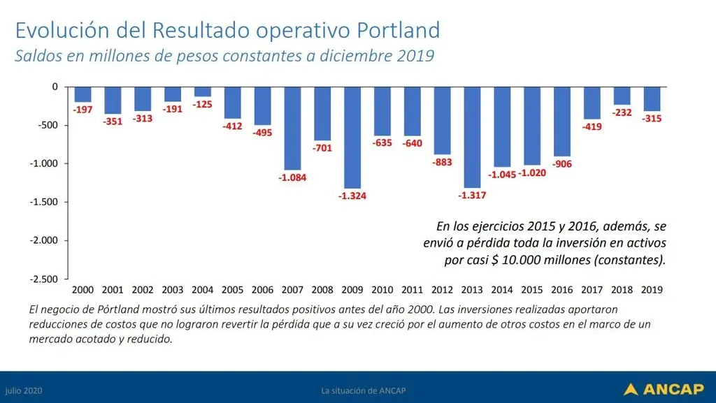 En Ancap se considera insostenible la situación del negocio del pórtland, que arrastra números en rojo desde hace 20 años de manera ininterrumpida. Las nuevas autoridades de la empresa tienen a estudio distintos escenarios con el objetivo de revertir esa situación.