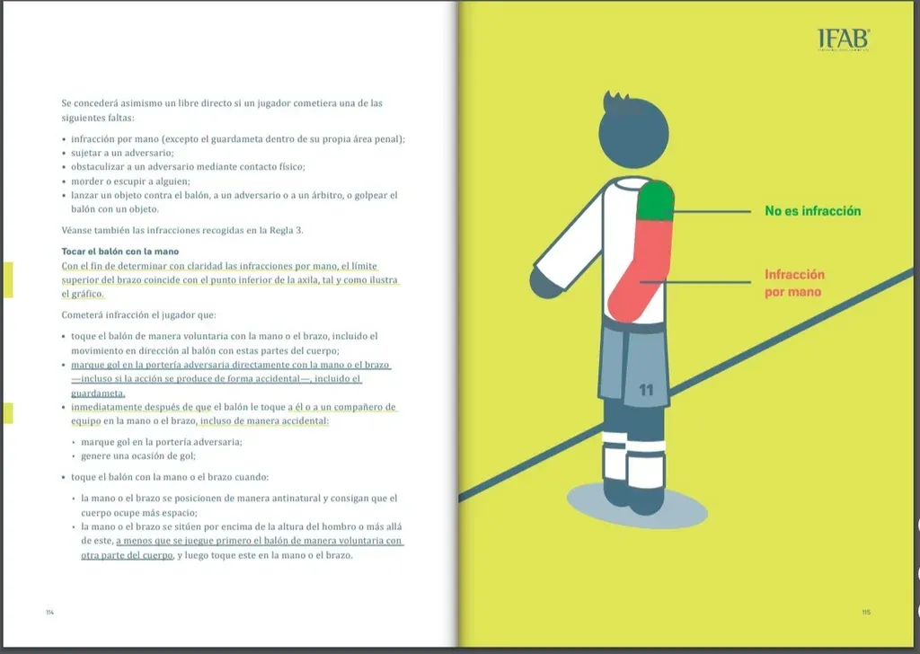 En la versión 2020, en su regla 12 (faltas y conducta incorrecta) el reglamento de FIFA sostiene que cometerá infracción el jugador que “toque el balón de manera voluntaria con la mano o el brazo, incluido el movimiento en dirección al balón con estas partes del cuerpo”, o también cuando “la mano o el brazo se posicionen de manera antinatural y consigan que el cuerpo ocupe más espacio”. Incluso (y esto también afecta a la mano de Vegas), el reglamento sostiene que “estas infracciones se considerarán como tales incluso en el caso de que el balón toque en la mano o el brazo del jugador tras haber rebotado en la cabeza, el cuerpo o el pie de dicho jugador o de otro que estuviera situado cerca del primero”.