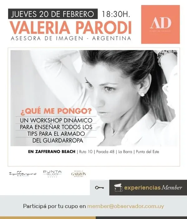 "¡¿Qué me pongo?!" Una pregunta que siempre nos hacemos. Para eso está el workshop de Valeria Parodi, la asesora y productora de moda argentina que el jueves 20 de febrero compartirá todos los tips para armar tu guardarropas y un sinfín de conjuntos según cada ocasión y estilo.