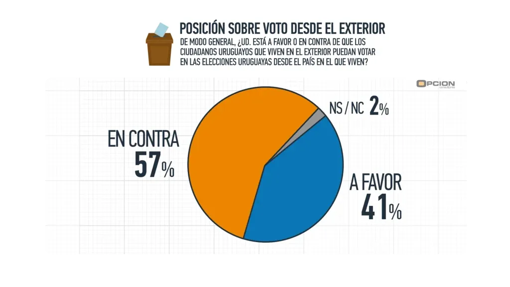 La mayor parte de los uruguayos está en desacuerdo con que los ciudadanos que residen en un país extranjero puedan votar en las elecciones presidenciales, según reveló un estudio elaborado por Opción Consultores que se emitió este miércoles en Telenoche.