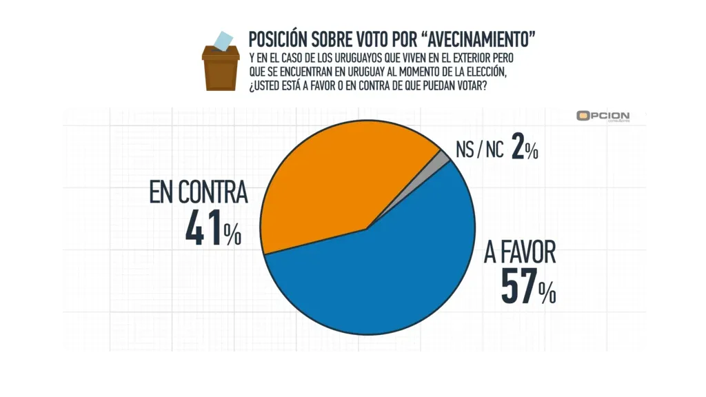 Sin embargo, cuando la encuestadora cambió la consigna y preguntó sobre si sería correcto aceptar el sufragio de los ciudadanos que residen en otro país pero que regresan a Uruguay únicamente para votar, los números se invierten. En esa situación, el 57% los uruguayos acompaña la iniciativa mientras el 41% la rechaza.