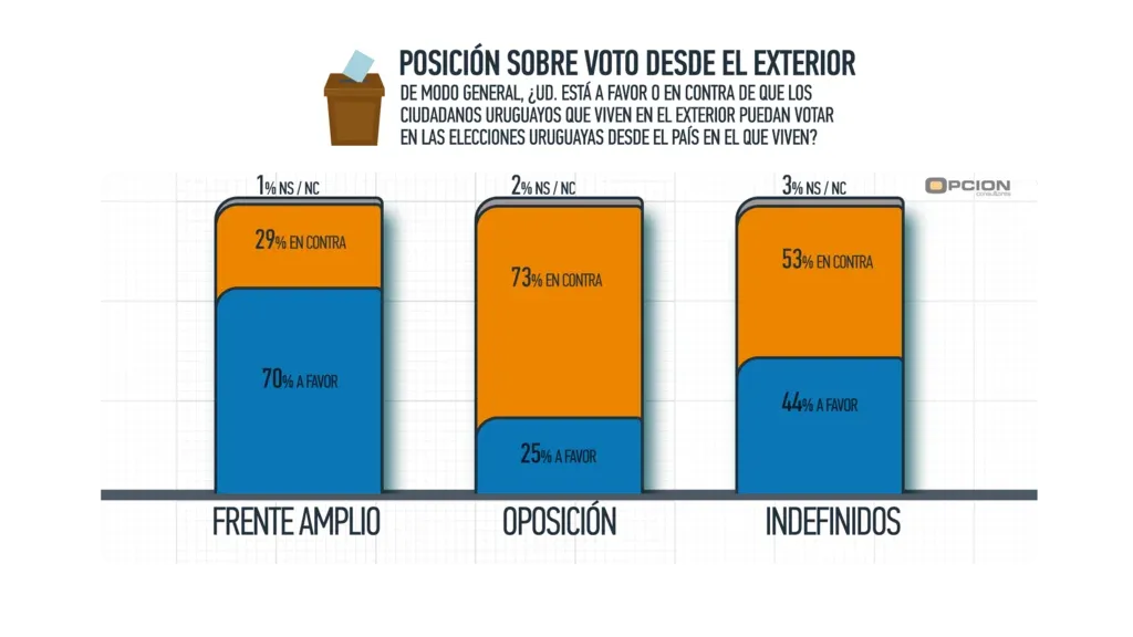 El estudio también midió el posicionamiento en función del partido político de los encuestados. Mientras que el 70% de los frenteamplistas está de acuerdo con implementar el voto desde el exterior, en la oposición el 73% lo desaprueba.