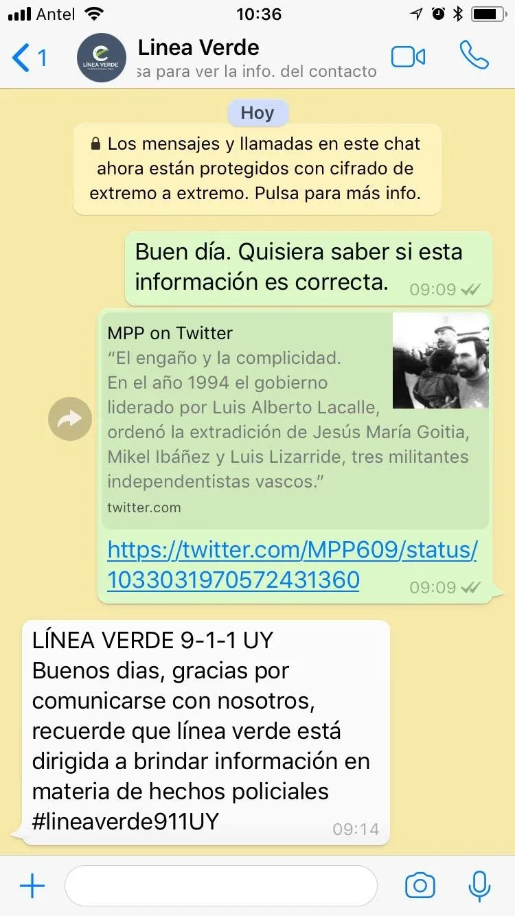 undefined Finalmente, ante la consulta sobre un hilo de tuits publicados por la cuenta del Movimiento de Participación Popular en el que se aseguraba que durante el gobierno de Luis Alberto Lacalle (1990-1995) se había ordenado la extradición de tres militantes independentistas vascos perseguidos por la Justicia española, el servicio policial respondió que Línea Verde “está dirigida a brindar información en materia de hechos policiales”, y no respondió la inquietud.