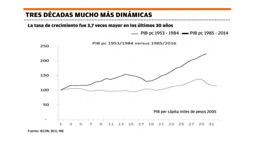 En un estudio realizado por el doctor en historia económica y socio de la firma CPA Ferrere, Gabriel Oddone, se señala que entre los años 1985 y 2016 la tasa de crecimiento del país fue 3,7 veces mayor en comparación al período 1953-1984. Aunque esta tendencia puede interpretarse que se da también a nivel global, las cifras del