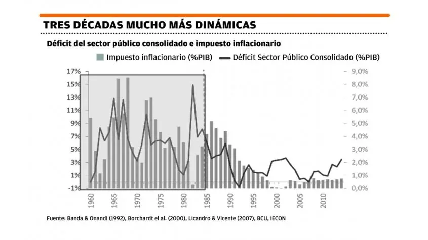 Mientras en los años 1960 y buena parte de los 1970, el déficit del sector público rondaba el 8% y llegó a alcanzar con la crisis de la "tablita" en 1982 un pico de 15%, la emisión monetaria era un recurso común para financiar el déficit fiscal, lo que desembocó en altos índices inflacionarios, que llegó a ser de 135% en 1967. De hecho, el promedio de la inflación desde ese período a 1998 fue del 63%, año en que se logró bajar finalmente a un dígito, tras un exitoso proceso de desinflación a finales del siglo pasado después de que se dieron algunos años de hiperinflación.