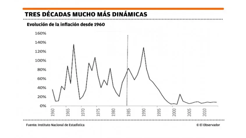 La inflación en Uruguay entre los años 1968 y 1998 promedió un 63%. A partir de ese año se logró bajar a un dígito, ubicándose en 8,63% a finales de la década de 1990. En 2017 los precios al consumo subieron 6,55%, según datos del Instituto Nacional de Estadística.