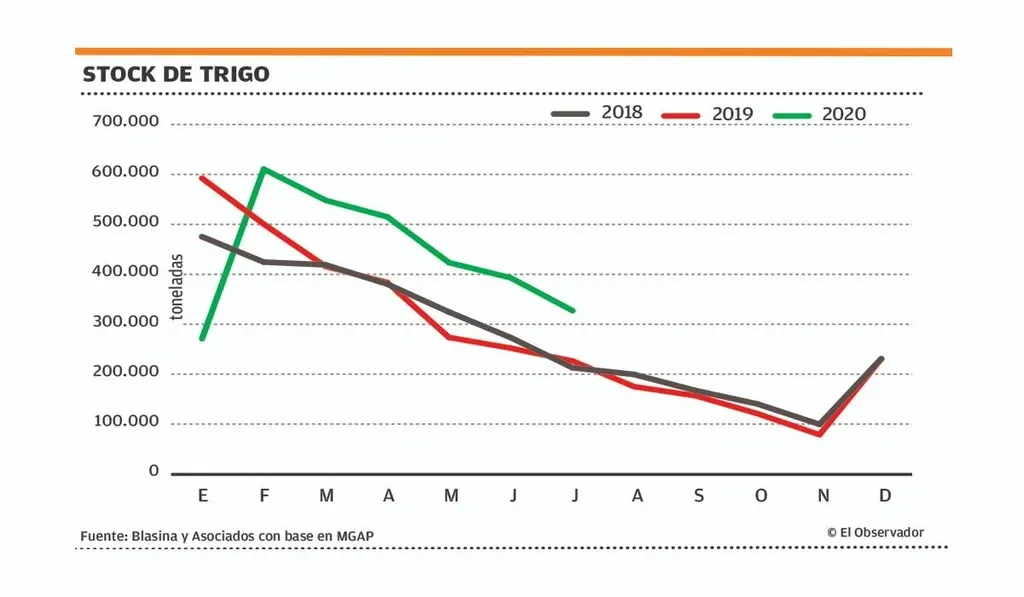 Pero las exportaciones de trigo de la pasada cosecha han sido lentas. Los stocks de trigo al 1° de julio son los más altos para esa fecha desde 2016. Totalizaron 327.118 toneladas, frente a las 226.343 toneladas de igual fecha del año pasado, según los datos del Plan Nacional de Silos.
